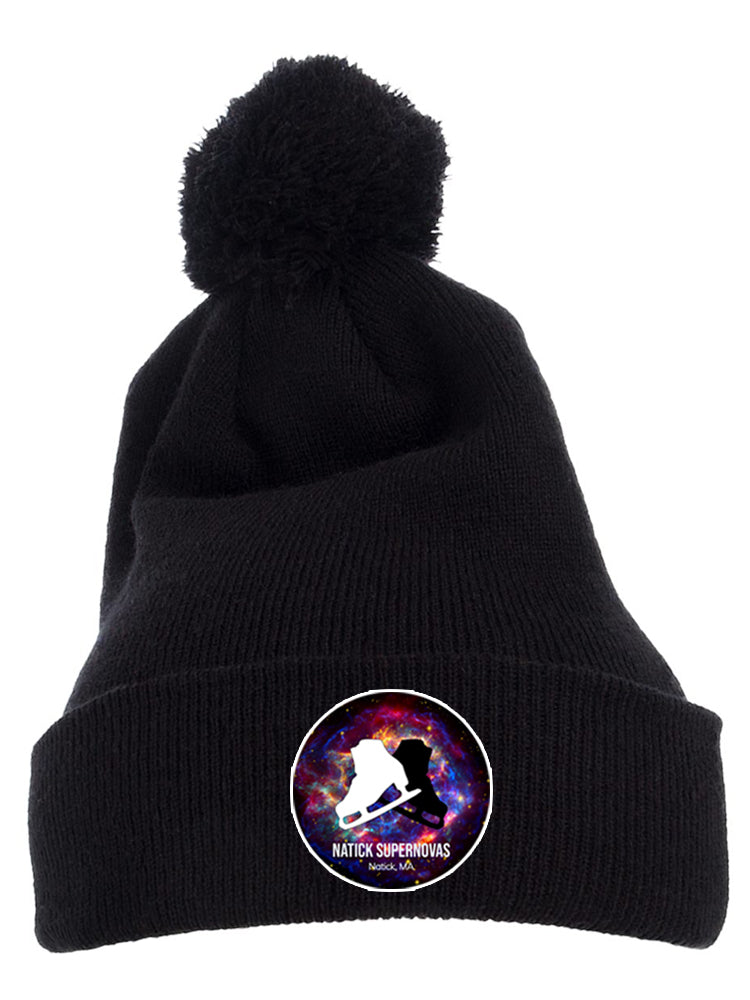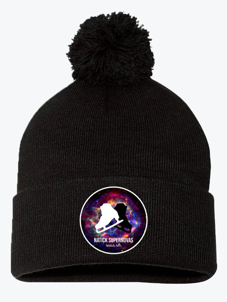 Standard pom-pom cuffed beanie with the Natick Supernovas logo printed on the front cuff.